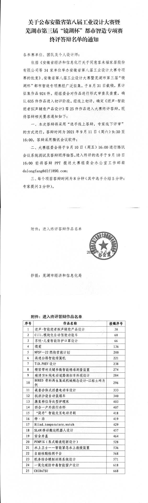 關于公布安徽省工業設計大賽“鏡湖杯”專項賽終評答辯名單的通知